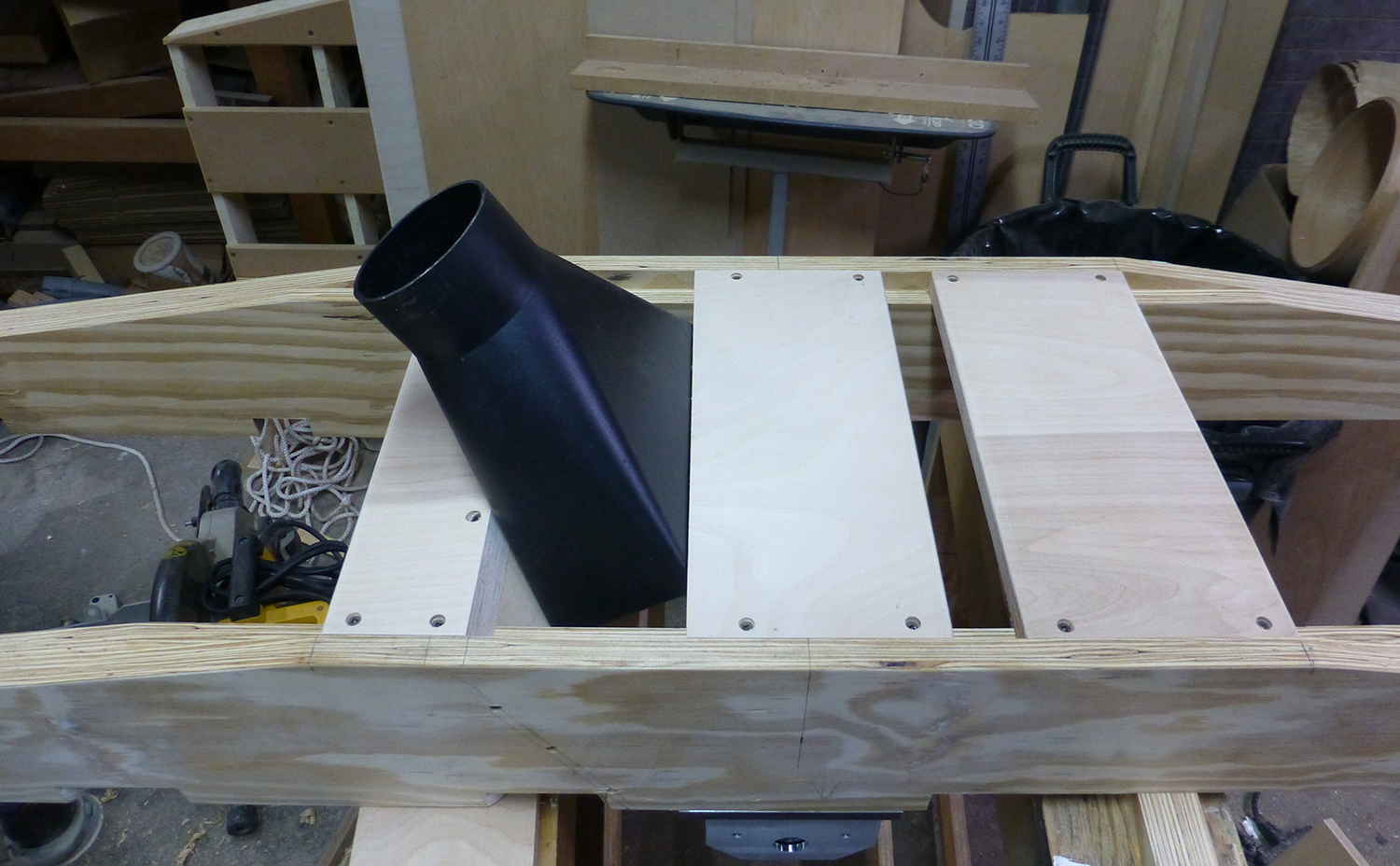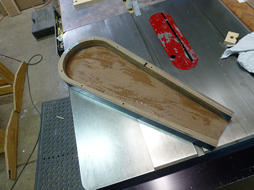 I then assembled the frame, and turned it upside down to install the bottom frame rails, which are 3/4" baltic birch. The rear rail (on the left) is angled and installed flush with the deflector plate. The center rail has an angled rabbet to accept the dust hood, which slides into place and bottoms out against the rabbet. The hood would later be installed with silicone, and small wedge blocks on each side to close the gaps and keep it from dropping.