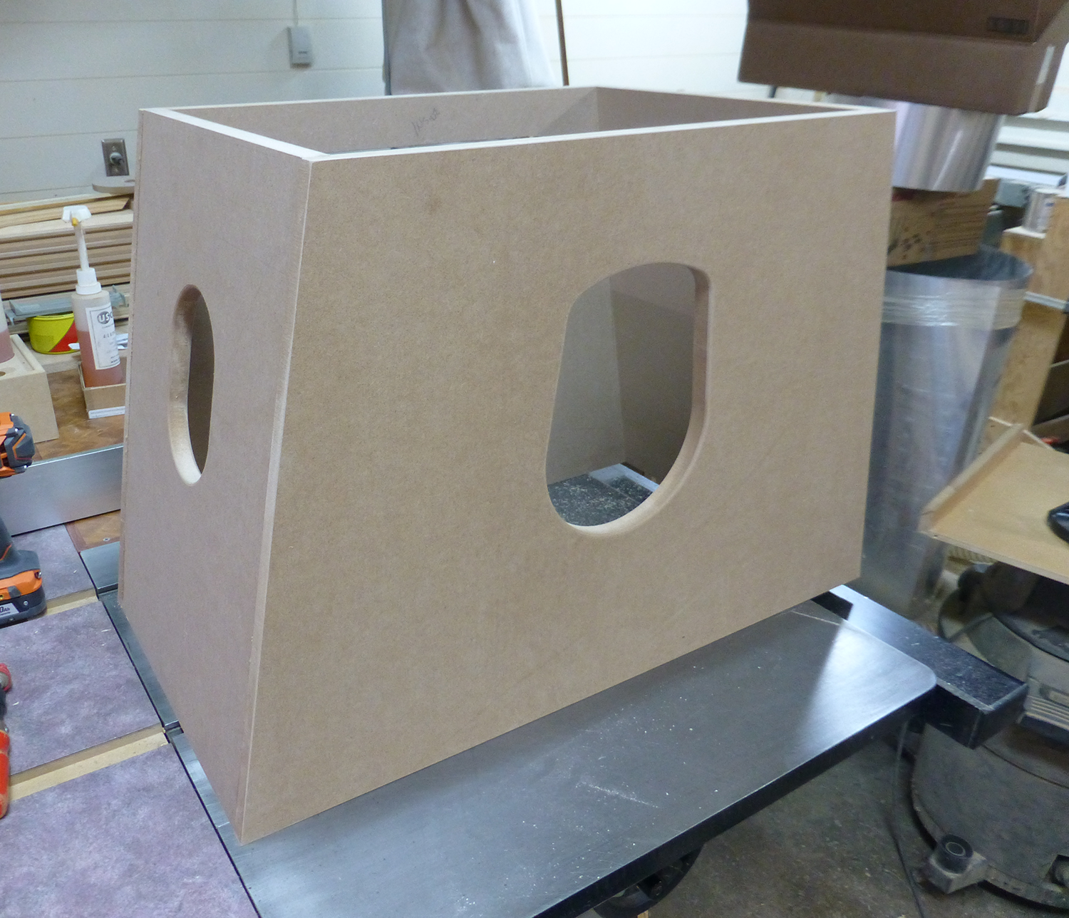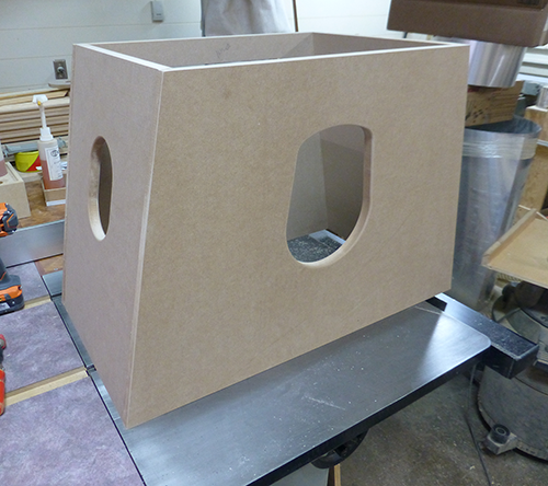 The base of the machine is made from 3/4" MDF. The front and back panels were cut on the CNC, as well as the cutout for the dust hose. Becasue MDF doesn't hold screws well, and tends to split, I rabbetted the front and back panels to accept the sides, and glued and clamped the 4 pieces together. I later glued in some corner blocks to reinforce the four corners.