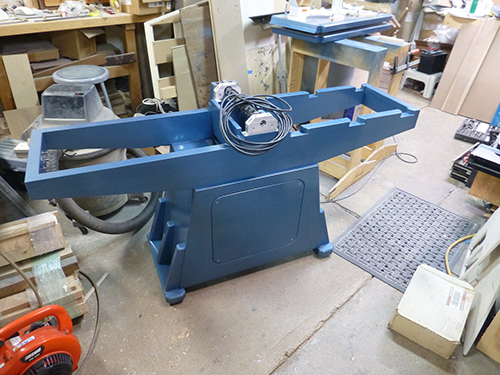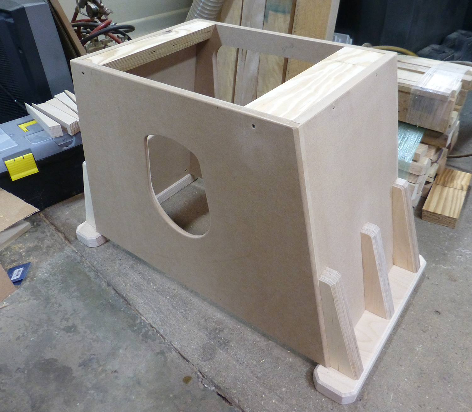 Enclosed base with dust collection. The original plans were for an open base with casters. I wanted to add integral dust collection, and a stable base to enclose the larger motor I was planning on using.