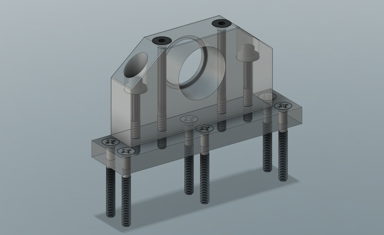 These were actually the first parts made for this machine. I feel that the bearing suppoorts are a weak point in Matthias' design. I didn't want to risk them failing, or wearing and needing replacing down the road. I also didn't feel comfortable simple screwing them into the frame, and wanted to have a method that allowed the bearing blocks to be removed. I decided on aluminum bearing blocks, which would bolt to steel plates which are screwed and bonded into the frame sides. Here's a detailed view from Fusion 360: