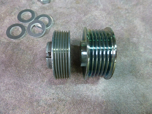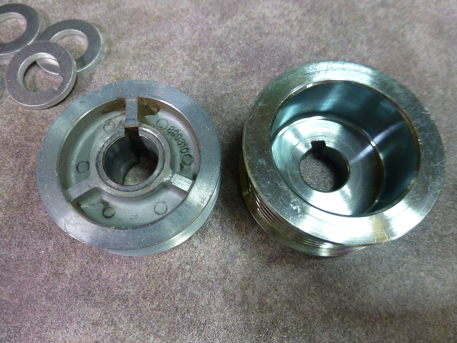 Automotove pulleys are "K" profile, which is much larger than the stock "J" profile. Here you can see the size difference.