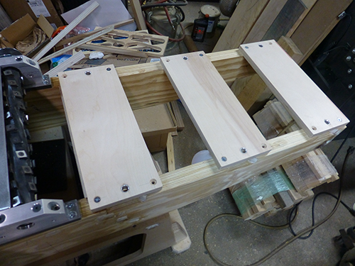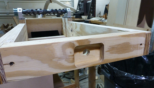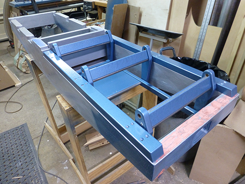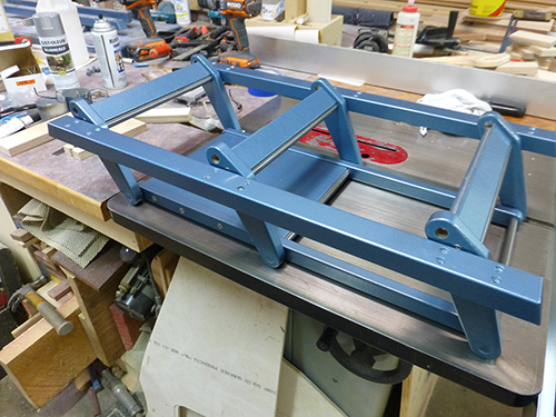 The frame is very simple, consisting of two side pieces, with a crossmember at each end to tie the sides together. The ends were rabbeted to accept the crossmembers, which were then glued and screwed in place. All screw holes were filled with an epoxy-microballons filler.