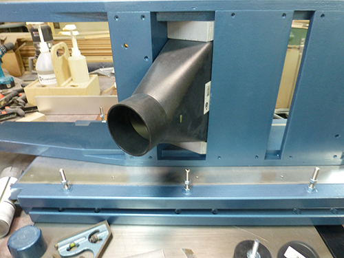 With everything painted, I could start on the final assembly. The dust chute is held in with a few dabs of silicone, and is a very tight fit, as I built the frame rails around it. Since it's narrower than the frame, there are two small blocks, one on either side, to close the gaps, and lock the chute in place. With the chute installed, I could mount the frame to the base.