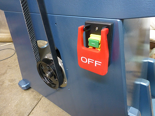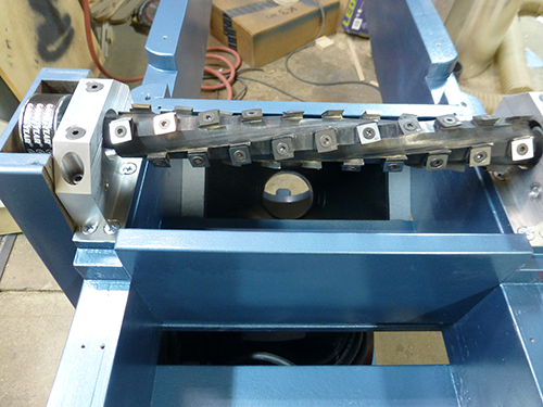 Here's a view of the cutterhead with a view of the dust chute below. This configuration works very well. Rear view of the machine showing the access door for the motor. The dust hose is also attached behind the access door. I keep a 10ft length of hose permanently attached to the machine, and can roll the dust collector over to it.
