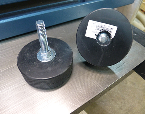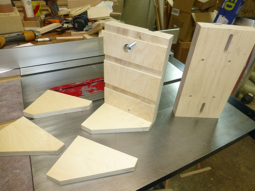 I made my own non-slip leveling feet from hockey pucks and carriage bolts. These were attached to baltic birch bottom plates, with baltic birch support brackets helping to firmly attache them to the MDF. I used the table saw and a sacrificial fence to chamfer all the baltic birch parts.