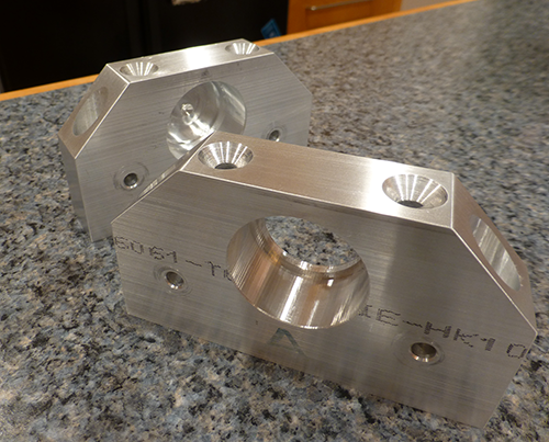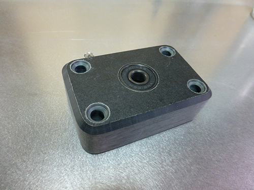 I orderd two blocks from ebay, 1" thick, and 3"x5". I drilled two holes so that I could bolt them to my CNC router's table, and machined them square. I also located the center hole for the bearing. Download bearing block pdf.