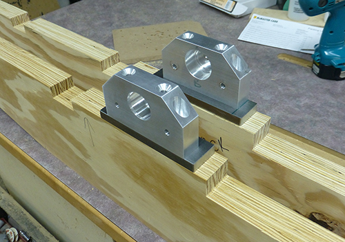Once the epoxy set up, I installed the cutterhead into the bearing blocks, and bolted them to the frame rails. This dictated the width of the frame, and allowed me to cut the end pieces to length. Also note the angled slot, which received a baltic birch deflector plate that the dust collection hood would mount against.