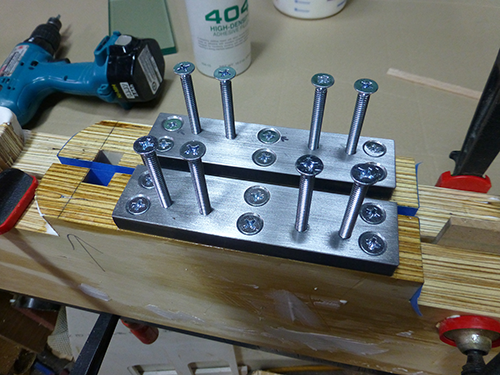 For the mounting plates, I puchased a 1/2" x 1-1/2" steel bar from McMaster-Carr, and cut it into two 6" lengths. Drilled and tapped for the four 1/4-20 mounting bolts, then drilled and countersunk six holes to attach them to the frame. I uses 1/4-20 x 3" screws, and epoxied the mounting plates (and screws) to the rails. I used some oiled screws to keep epoxy out of the threaded holes while it cured.