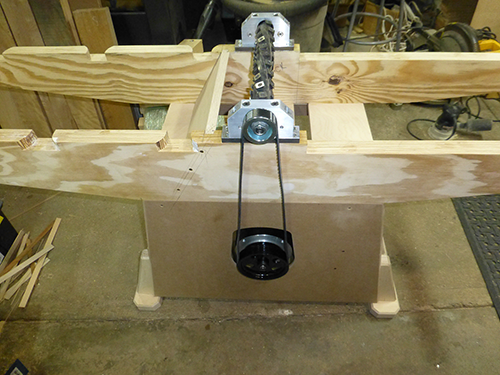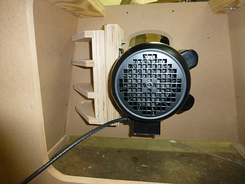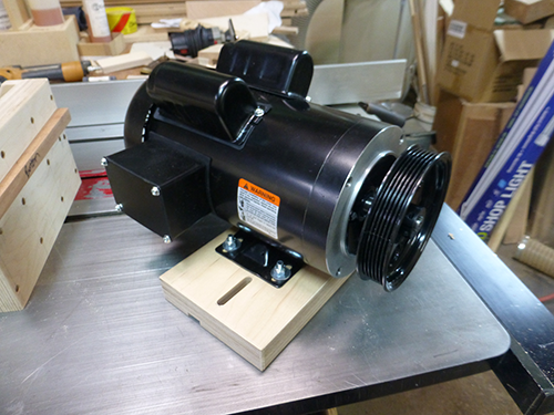 I designed a simple motor mount from baltic birch, where the weight of the motor would provide the belt tension. The motor mounts to a 1-1/2" thick plate with carriage bolts, and this plate slides along another 1-1/2" plate with a key to keep them aligned. Two more carriage bolts allow the motor to be locked in place. Loosening the two nuts allows the motor to slide up and down. Four triangular brackets help to hold the motor in position. The assembly is glued to the MDF front panel, with about 12 screws assisting.