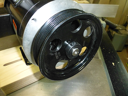 The original pulley on the cutterhead was a 6 groove Poly V "J" profile belt. The motor spun at 20,000 rpm, and the cutterhead at 10,000 rpm. With the new motor being 3450 rpm, I needed to find a rather large pulley to increase the cutterhead speed. The problem is that these can be very expensive, upwards of $100. I asked another jointer builder, medicineman007 on YouTube, what he was using, and found out that a power steering pulley would work for the motor, and an alternator pulley for the cutterhead. I went with a Dorman 300-008, which was about 5-1/2" diameter, and about $17 at Amazon. For the cutterhead, I used a 55mm alternator pulley from EBay, for about $12.