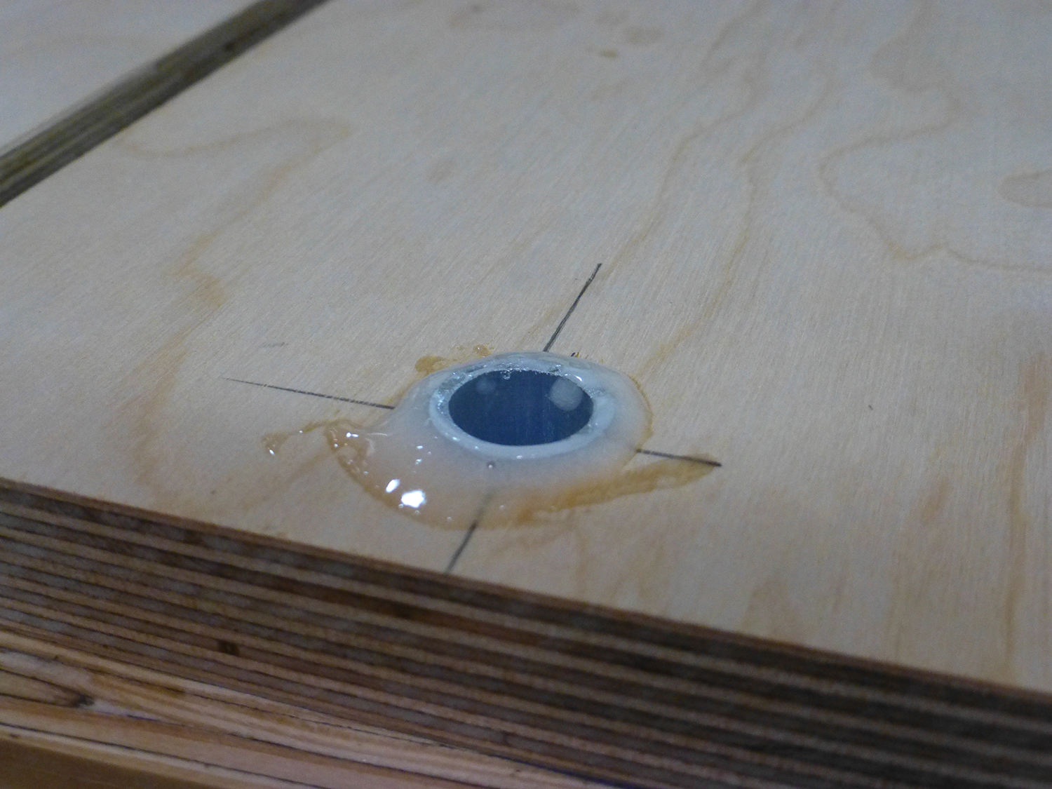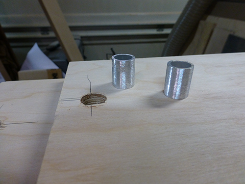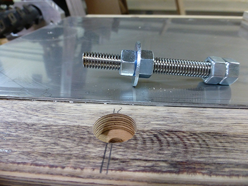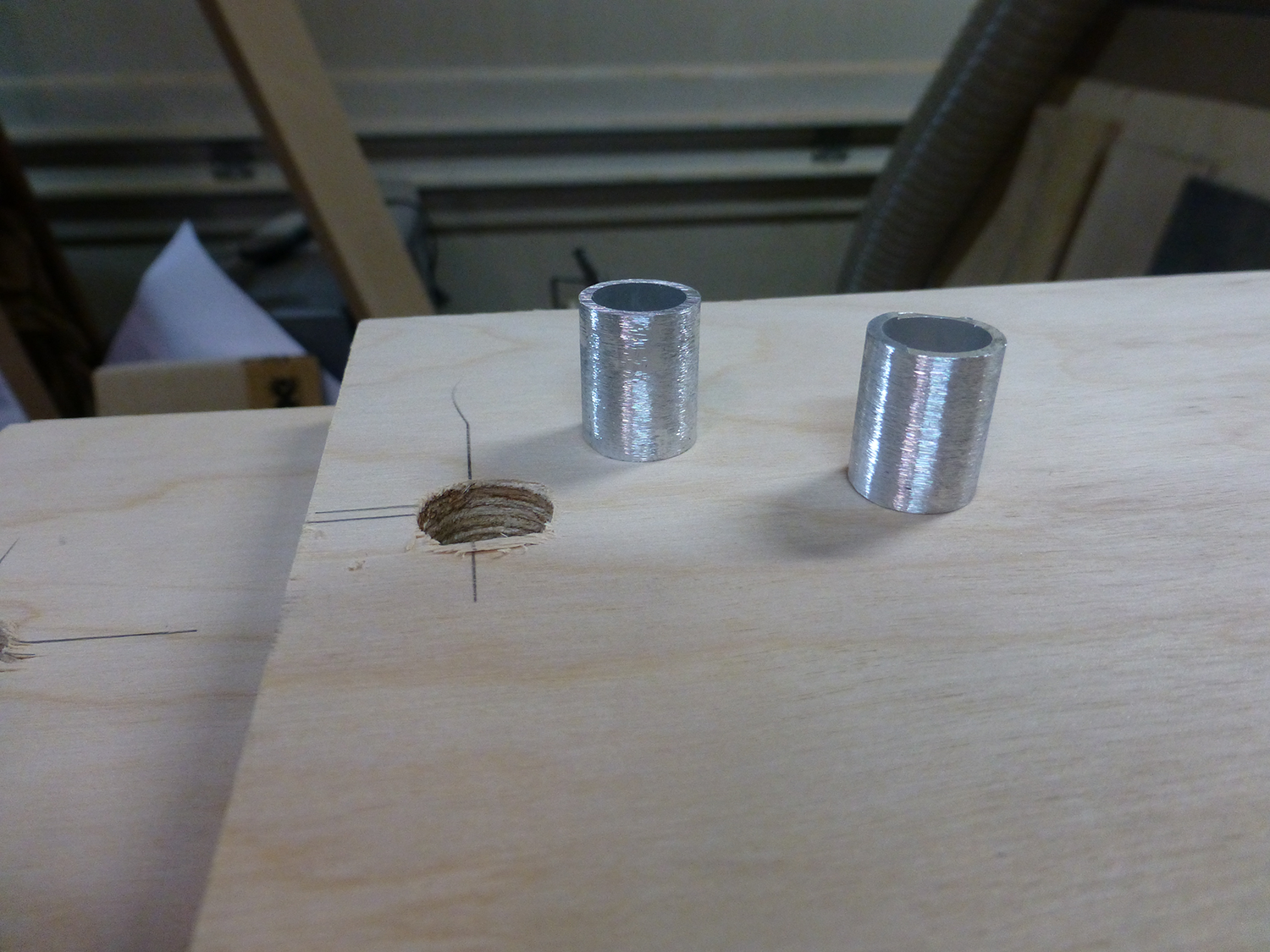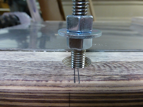 The threaded rods are supported by and mounted to 3/4" baltic birch rails. I don't like to tighten nuts and other hardware to wood, as it will usually crush the wood, and loosen over time. To prevent this, I lined the holes in the rails with aluminum tubing. This allows me to tighten nuts against both sides of the rails without it being crushed.