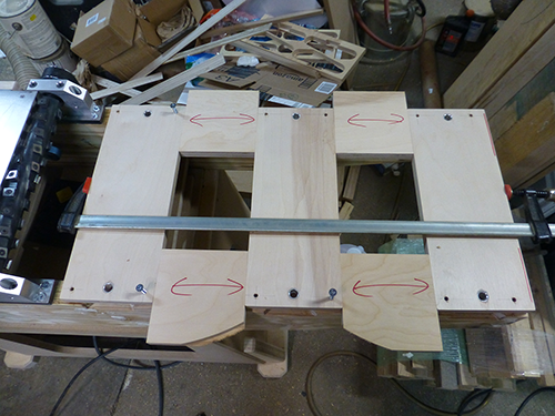 While I'm not entirely sure if they are needed, I added the spacer plates between the steel rods. 3/4" baltic birch, with the edges routed to accept the rods. I used a 1/2" core box bit in a router table.