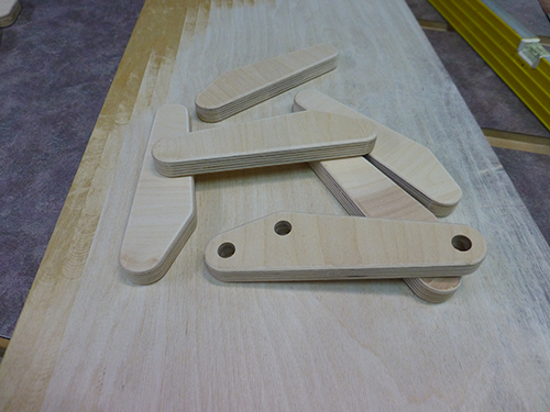 I cut the parallelogram links from 3/4" baltic birch on the CNC. I cut one extra to use as a template, and drilled 1/8" holes to locate the holes. To get a tight fit, I ground down an old 1/2" forstner bit I had by chucking it in my cordless drill, and spinning it against my 6"x48" belt sander. The template was screwed to each link, and the three holes were drilled on the drill press, giving me 6 identical links. The screw holes from the template were filled prior to painting.