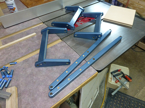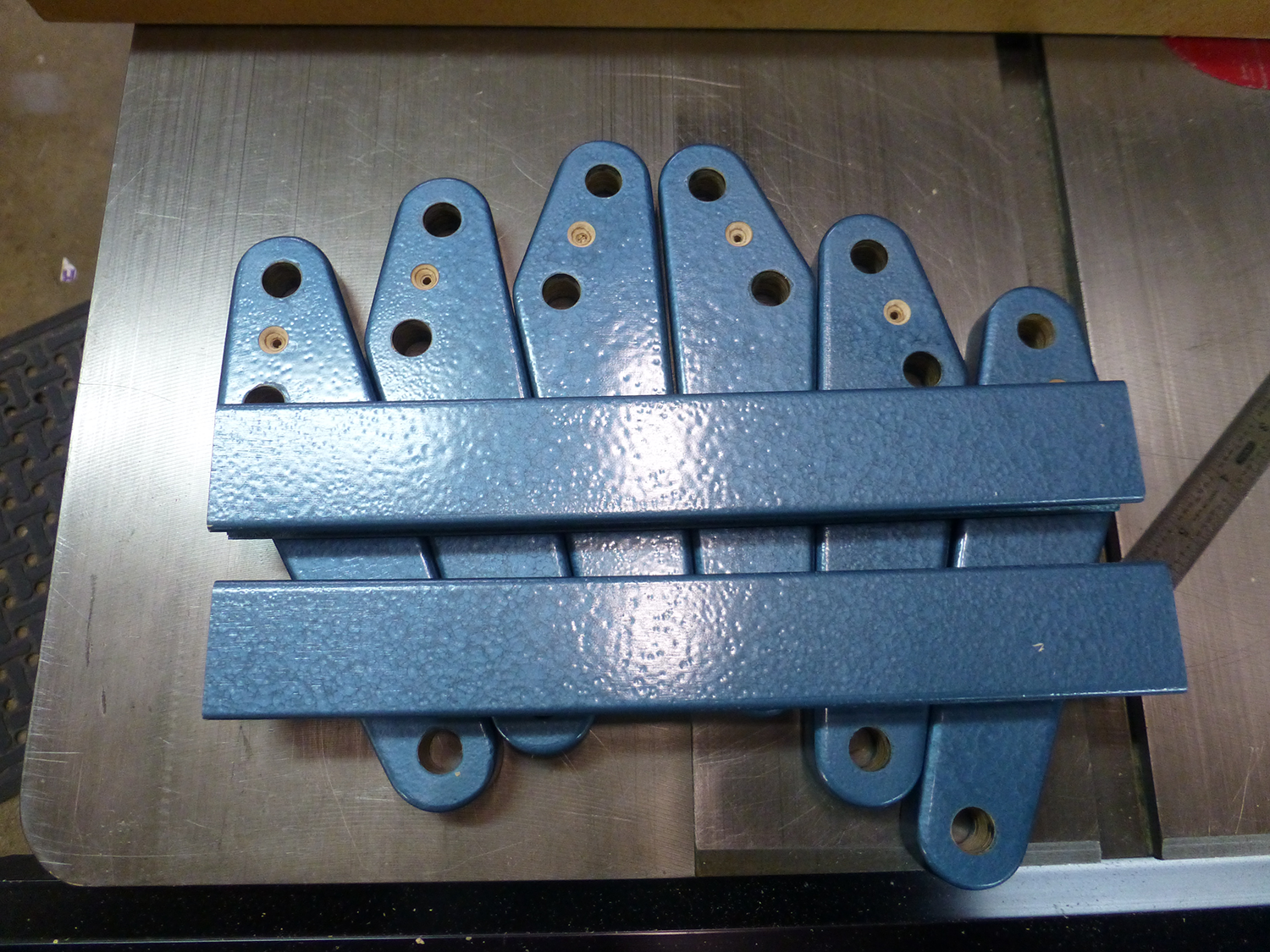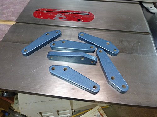 I used nylon washer between all moving parts, mainly to keep the paint from wearing off over time. Here's the links and bottom rails assembled and ready for installation. (Note: The links are backwards in this pic.)