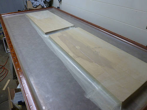 The biggest concern I had with building a jointer, was the tables. A jointer with tables that aren't flat is not a very good jointer. I was concerned that the "floating steel" method that Matthias used would not remain flat over time, and I was also unsure that I could get steel that would actually be flat when I received it. My plan was to permanently bond steel to both the top and bottom of the tables, making them torsion box type structures, with solid cores. The cores of the tables are made up of 3 layers of 1/2" (12mm) baltic birch plywood, epoxied together in my vacuum frame press. My frame press table is a torsion box that's been cnc machined flat. Unfortunately, the baltic birch I had was not very flat, and the tables had a slight warp in them after removing them from the press. I used my CNC to flatten them, removing about 1/32" from each side.