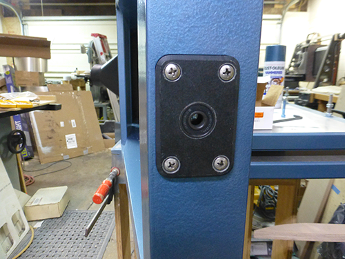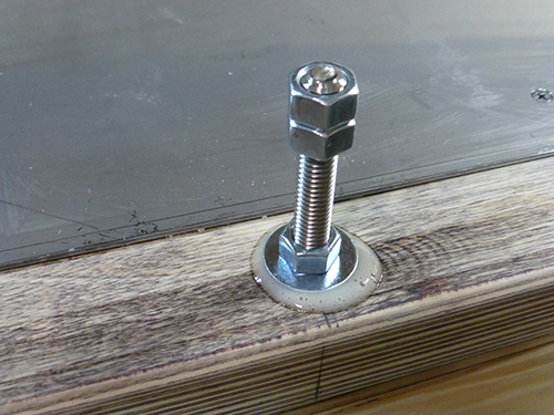 The outfeed tables are mounted with threaded studs, which are embedded into the table. I used 5/16 threaded rod. The double nuts are to drive it in with an impact driver. The bottom nut is epoxied into a counterbore. The original design used 4 mounting studs, but with my longer tables, I used six. This allows me to adjust out any bow or twist in the outfeed tables.