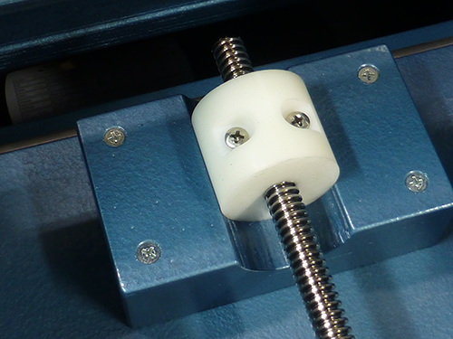The screw is 1/2-8 acme, with a homemade delrin nut. This gives you a tight fitting nut, with no play. And delrin is slippery, so no lubrication is required.