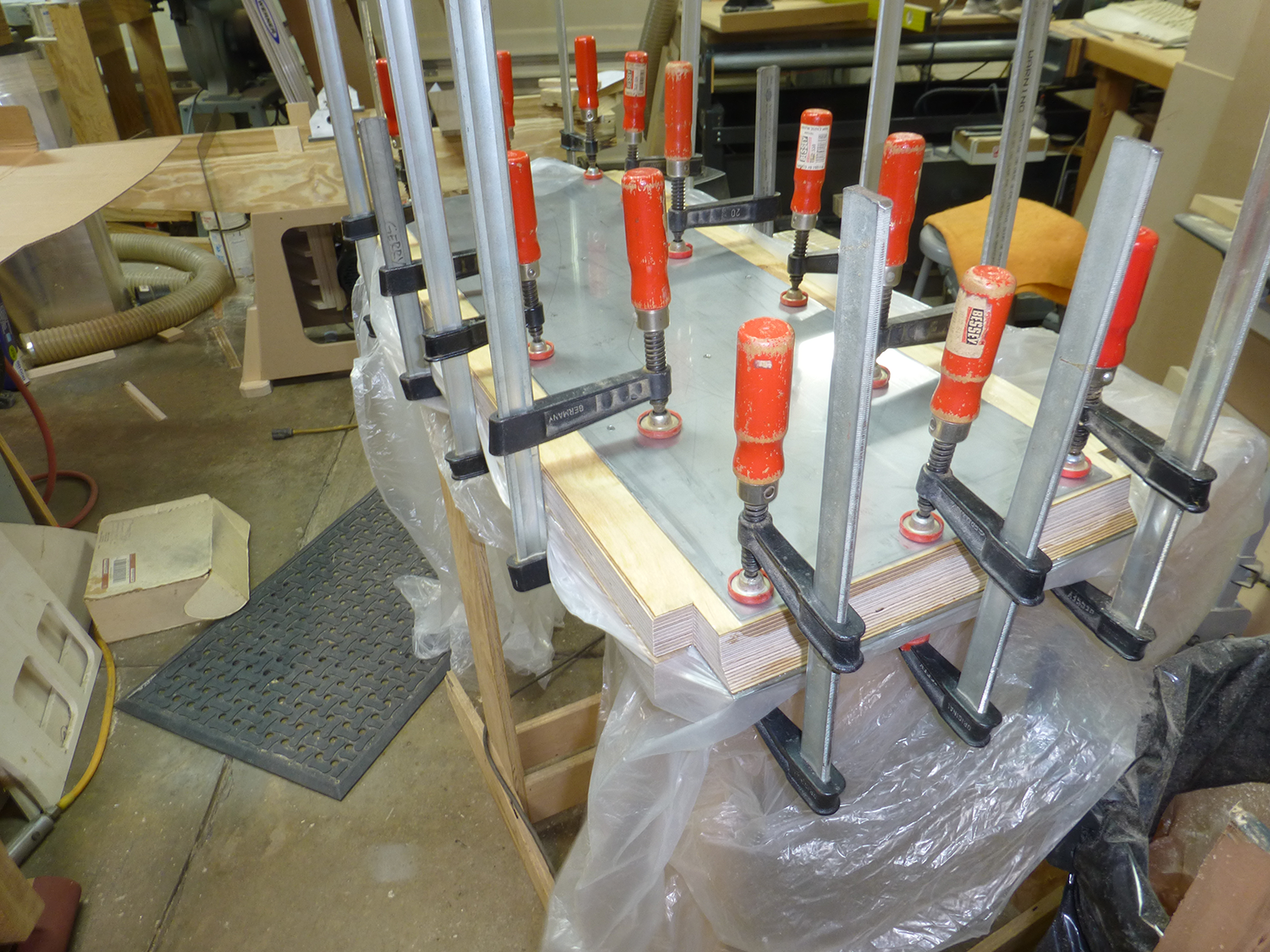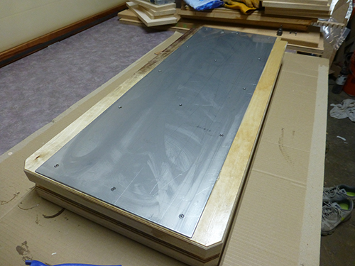 I had been searching for sources of steel for several months up to this point, and not finding what I wanted for a reasonable price. While browsing Ebay one day, I found the perfect items. 14 gauge stainless steel, $30 for 30" x 36". The nice thing was that the seller would cut them to size for free! So, I bought two, and had them cut into 13-1/2"x36" pieces, and got my four pieces for about $90 delivered. They were cut perfectly, too. Flatness was not critical on the bottom side, so I drilled and countersunk the sheets, and epoxied and screwed them to the bottoms of the tables. The next day, I was surprised at how un-flat they were. Low spots around the screws, and high spots between the screws where the epoxy was trapped. I knew I'd need a different method for the tops. I first drilled and countersunk them all. In order to keep them from moving, I used two screw in each plate, in the center at each end. I screwed them in by hand, just enough to hold them in place. I checked for flatness with a straightedge to make sure they weren't too tight. I then clamped them together, face to face, with some plastic between them to keep them from sticking together. Once the epoxy cured, I cleaned up the holes, and epoxied the remaining screws in place.