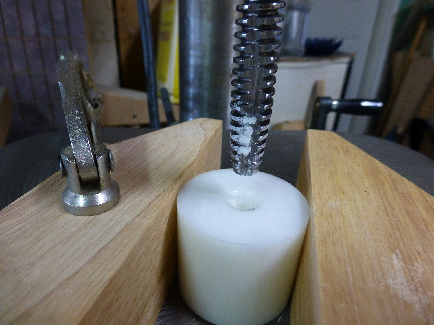 To make the nut, I cut a length of 1-3/4" diameter delrin rod, and drilled a 3/8" hole in the drill press. I made a tap from a cutoff piece of the acme rod. I chucked it in my drill and tpaered the end agaiunst my 12" disc sander, then cut a "flute" with an angle grinder.